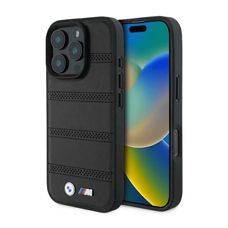 BMW hc m magsafe pu perforated and stitched lines black iphone 16 pro - TOP MOVIL